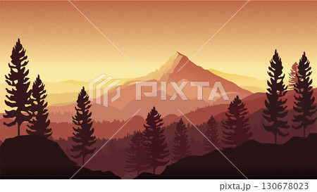 Mountains Landscape and Sunrise with River Flat Grunge Texture Hand Drawn.Vector Illustration