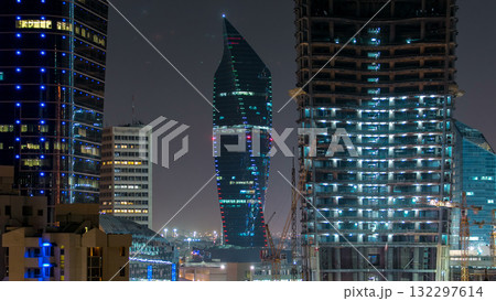 Skyline with Skyscrapers night timelapse in Kuwait City downtown illuminated at dusk. Kuwait City, Middle East