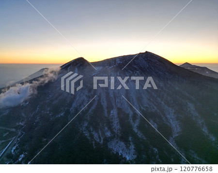 雲海に浮かぶ大浪池と霧島山麓の夜明け前の空撮