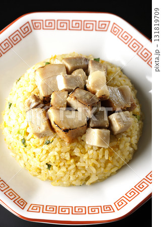 角切りチャーシュー乗せ玉子チャーハンを黒背景で撮影