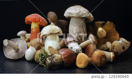 Freshly picked wild mushrooms, showcasing diverse species and vibrant colors, arranged on a dark surface