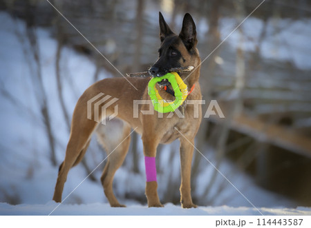 Belgian shepherd malinois dog with two toy rings and wooden stick