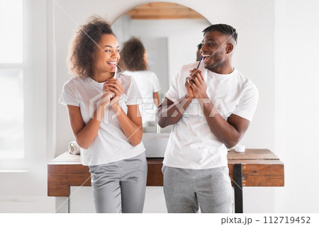 black couple enjoys fun moment of teeth brushing in bathroom