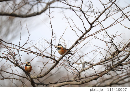冬枯れの木の枝で木の実をくわえるヤマガラ