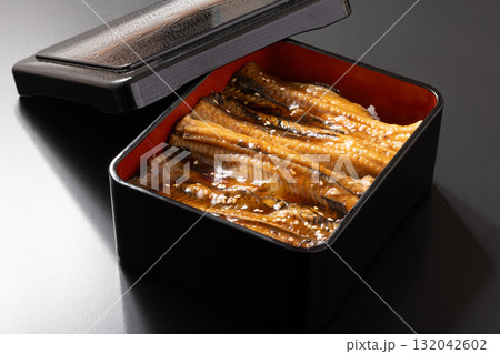 曲げわっぱ入り鰻丼弁当を黒背景で撮影