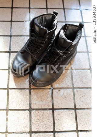 濡れたタイルの上に置いてあるメンズのスノーブーツ