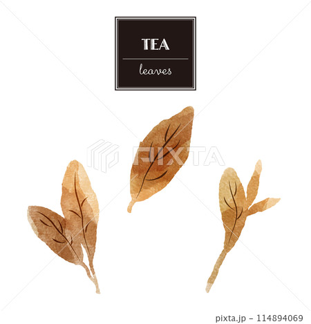 シンプルな茶色の葉っぱの水彩イラストセット(紅茶、烏龍茶、黒茶など)
