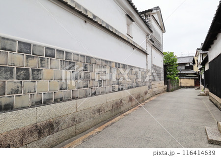 日本の岡山県にある美観地区の風景。なまこ壁のある小道。
