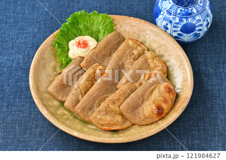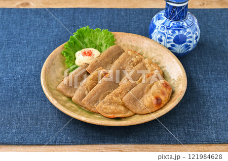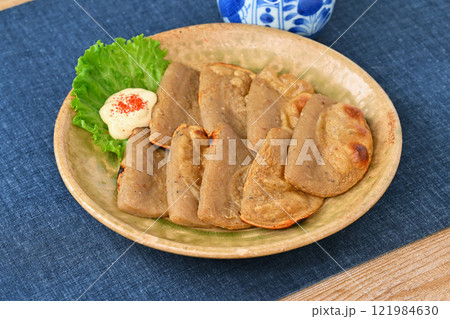 皿に乗せた黒はんぺんのフライ、揚げ物