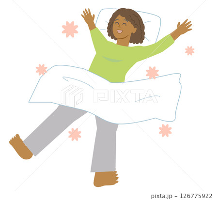 休日にリラックスしてベッドで伸びをする若い黒人女性