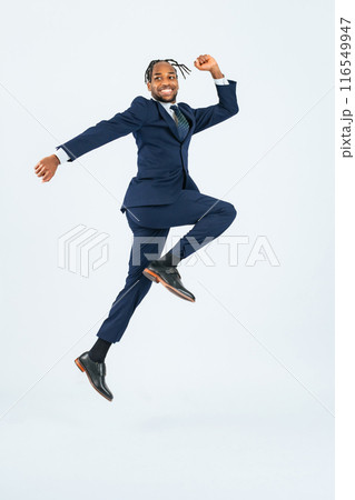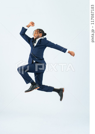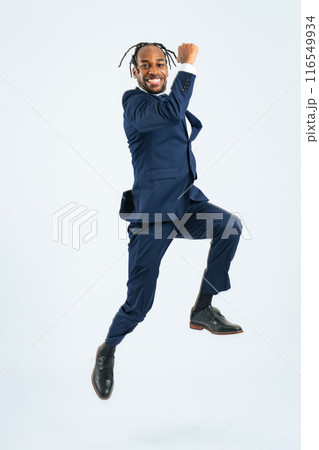 ジャンプする黒人ビジネスマンの全身写真