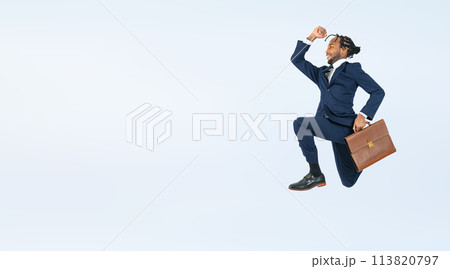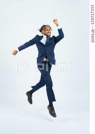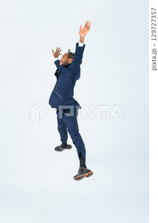 ジャンプする黒人男性ビジネスパーソンの全身写真