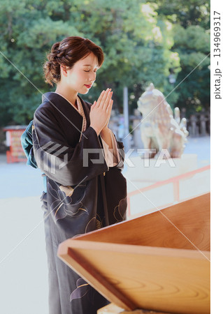 神社の神殿に参拝する振袖姿の女性|祈り・伝統・日本文化