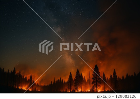 Forest fire at night with glowing flames illuminating trees under a starry sky