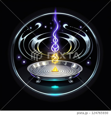 Glowing energy symbol floating above a circular plate surrounded by swirling light effects against a black background creating a mystical and vibrant atmosphere.