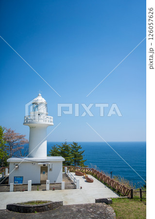 「岩手県」青空と新緑に映える白亜の黒崎灯台 岩手県