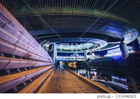 名古屋市、高架下から見上げる入り組んだ黒川インターチェンジの巨大ループ線の夜景