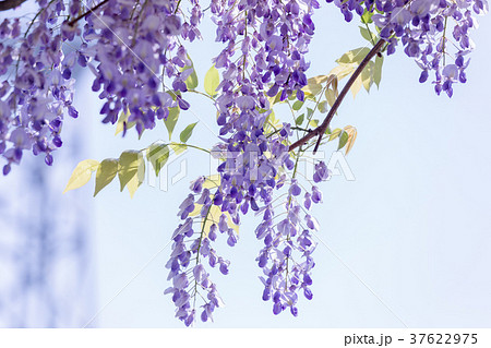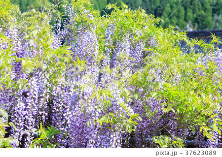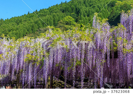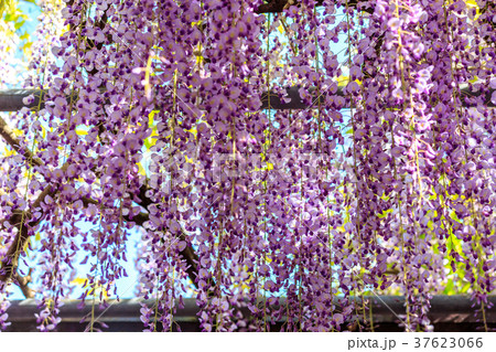 春風に美しく揺れる藤棚(藤の花)「黒木の大藤 素盞嗚(すさのお)神社」福岡県八女市黒木町