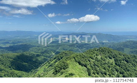 黒松内岳と北海道の広い草原と白い雲浮かぶ広い青空