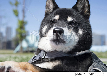 ハーネスをつけた黒柴犬