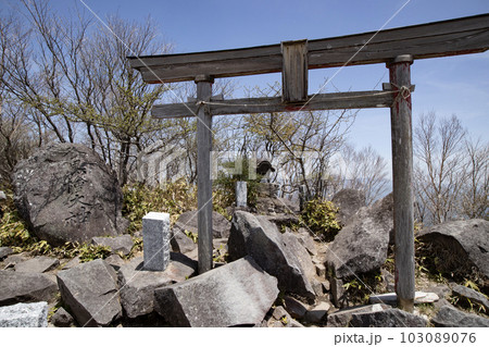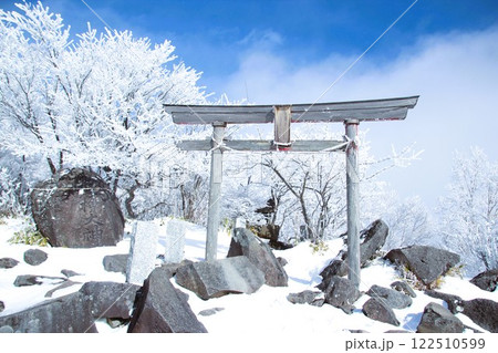 冬の赤城山 黒檜山の山頂付近にある黒檜山大神の鳥居と祠