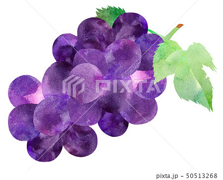 葉付きブドウ(巨峰)2種と分離した果実の水彩イラスト。