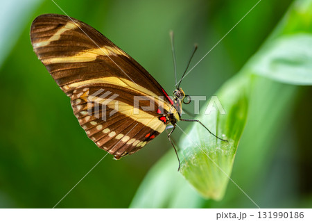 Close-up macro of a zebra longwing butterfly Heliconius charithonia resting on a green leaf. The