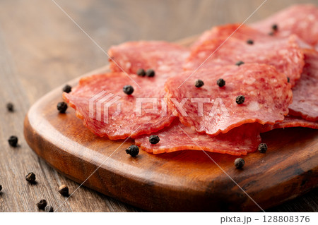 木製のカッティングボードに載せた美味しそうなサラミのスライス