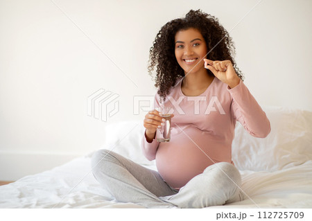 Smiling black pregnant woman showing vitamin pill and holding glass of water