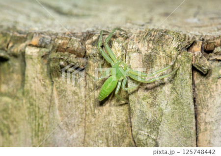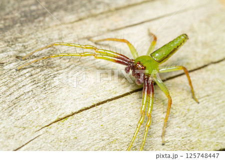 生き物 蜘蛛 トラフカニグモ、長い前脚と菱形の胴体。地味な体で好物のアリを待ち伏せ