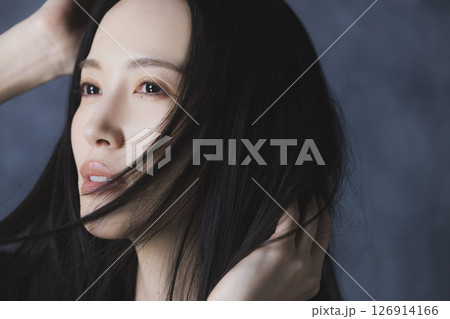 黒髪ロングヘアの若い女性(ビューティーイメージ)