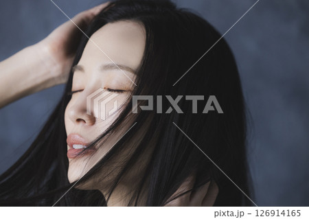 黒髪が風になびく美しい日本人女性。美容、健康イメージ