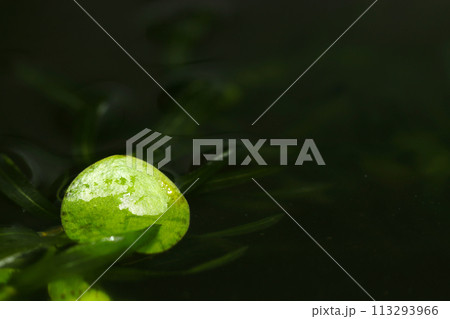 暗い水面に浮葉植物アマゾンフロッグビット(自然光+マクロ接写写真)