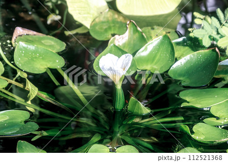 野池に浮葉植物トチカガミの青葉の中、白い花が咲く(マクロレンズ使用・自然光・接写写真)