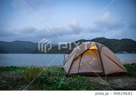 野営キャンプ ソロテント 無骨キャンプ 後ろ姿 海コピースペース ランプ 灯り 夕暮れ 夜キャンプ
