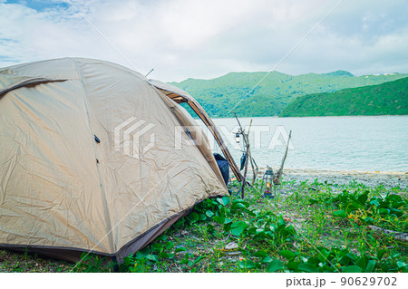 野営キャンプ ソロテント 無骨キャンプ 後ろ姿 背景 海コピースペース