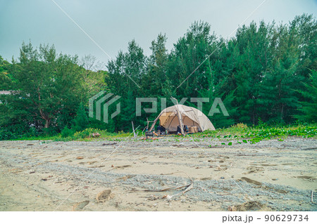 砂浜と森の野営キャンプ ソロテント 無骨キャンプ 森林 空 コピースペース