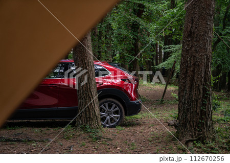 赤 車 日本車 ドライブ 山道 キャンプ場