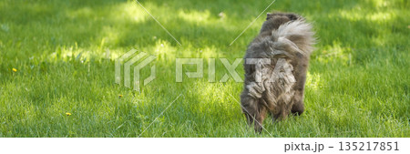 Fluffy brown dog sniffing grass in sunny park