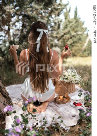 Picnic Woman Strawberries: Sunny day, woman enjoys picnic with strawberries and coffee in a serene meadow.