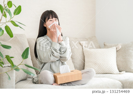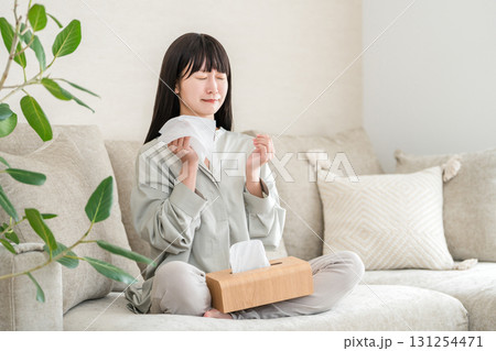 花粉症,鼻炎で鼻を噛む若いアジア人女性(スギ花粉,ヒノキ花粉,アレルギー性鼻炎)