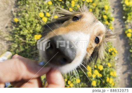 飼い主からおやつをもらう犬 シェルティー 広角 鼻デカ犬