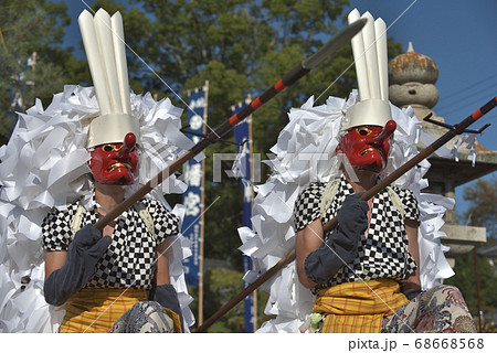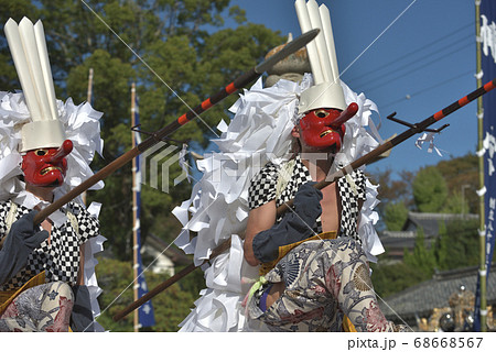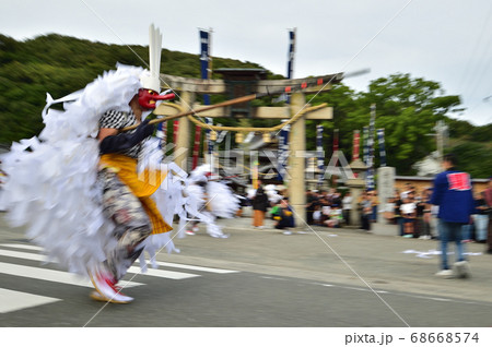赤穂八幡宮の秋祭り 鑓を持ったハナダカが鳥居の前で踊る