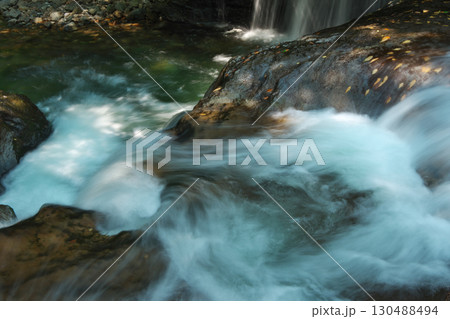水面に浮かぶ落葉と渓流(龍頭八重滝県立自然公園:雲南市)