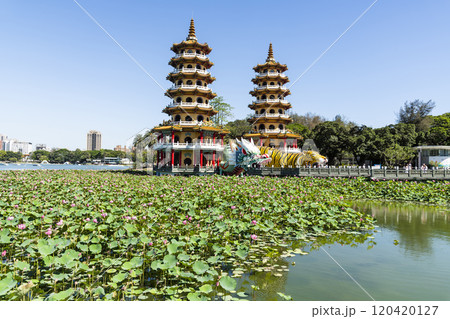 View of the lotus in bloom at the Dragon and Tiger Pagoda in Lotus Pond, Kaohsiung, Taiwan.