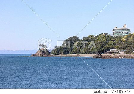 土佐の桂浜の竜王宮(下龍頭岬の左に浮島現象が見える)