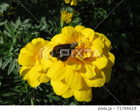 黄色いマリーゴールドの花の蜜を吸う蝶