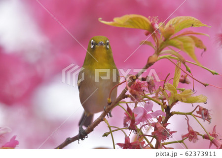 寒緋桜の美しいピンク色に囲まれた春を告げる緑の小鳥、めじろ右向き。