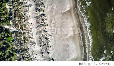 Sandy beach. Seaside vacation, golden beaches. Blue waters of the sea. Lake, ocean, sea