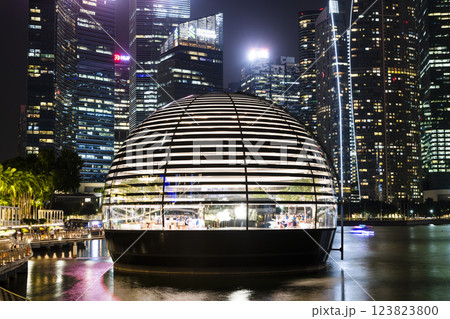 Night view of the Apple Marina Bay Sands with a skyscraper background, Singapore, is the first Apple store in the world surrounded by water.